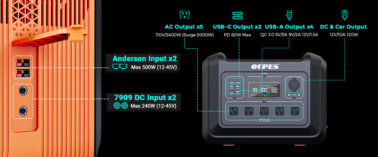 • AC Output Power 2,400W Rated Power, 5,000W Peak Power