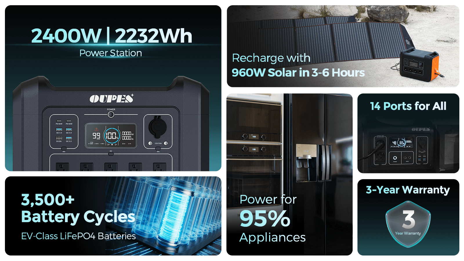Lasts for 10 Years Stable LiFePO4 Battery OUPES 2400W uses EV-grade LiFePO4 battery, which can be used for 3500+ cycles at 80% depth of discharge. Combined with OUPES' advanced battery management system, the OUPES 2400W is incredibly safe and durable.